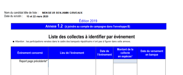 Documents pour la CNCCFPAnnexes Annexe 1.2 - Liste des collectes Seul le montant global est affiché automatiquement, la liste des événements avec les dates et les montants sont à remplir manuellement.