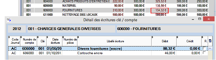Vous pouvez double-cliquer sur tous les montants en rouge (« réalisés ») afin de consulter le détail des écritures à l'origine de ce total :