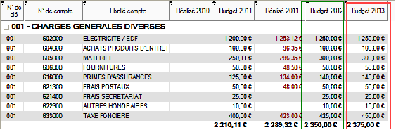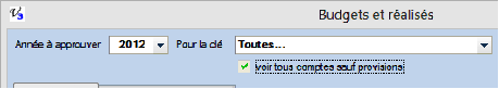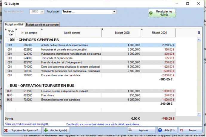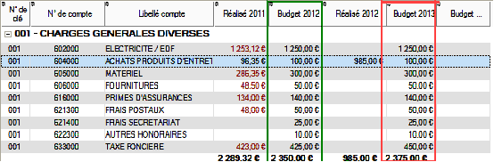 La colonne Réalisé est calculée en fonction des écritures passées, elle permet également à tout moment de suivre la situation et l'état des dépenses. Par défaut, l'affichage concerne toutes les clés mais on peut filtrer sur une clé spécifique. Les réalisés apparaissent en rouge et les budgets en noir, seuls les budgets sont modifiables.