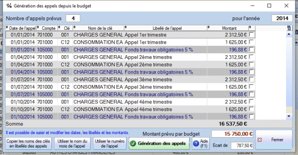 Le bouton « Générer les appels » va utiliser les montants par clé et le nombre d'appels prévus dans l'année (voir Paramétrage, onglet Comptes et Divers) pour calculer et proposer des appels.
