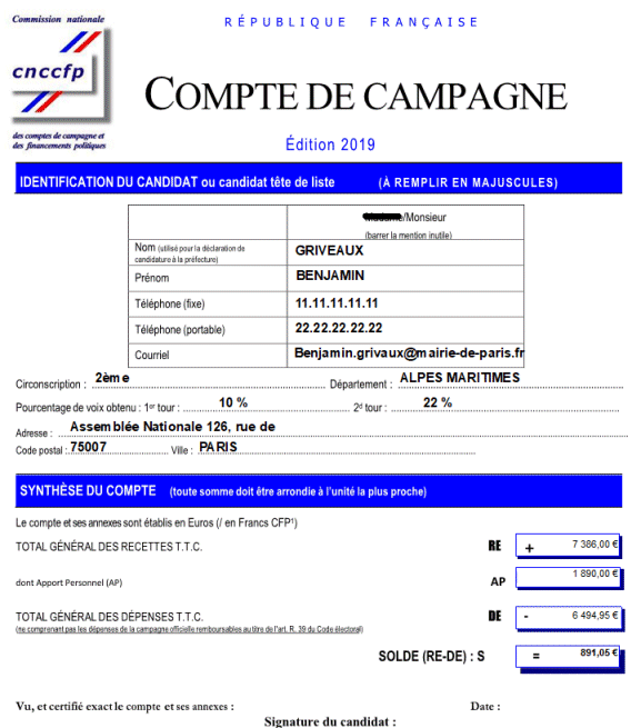 C'est le document principal à fournir à la CNCCFP, il reprend quelques informations générales (paramétrage et fiche de la tête de liste) et surtout la synthèse des comptes.