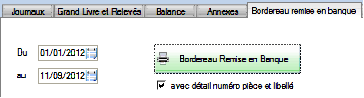 Attention : les dates sont les dates de réceptions du chèque (si vous utilisez la date de signature du chèque, vous risquez d'avoir des problèmes au niveau de l'édition du bordereau puisque qu'un chèque sur une période déjà éditée va se mélanger avec les chèques déjà remis…). Il peut être commode d'utiliser un compte intermédiaire comme le 511.
