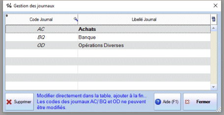 Par défaut, il y a trois journaux : Achats / Banque et Opérations diverses avec les codes AC, BQ et OD.