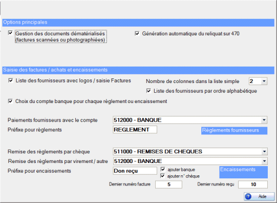 Ce sont quelques options et paramètres plus techniques, en particulier la gestion des documents numérisés, la présentation de l'écran de saisie des factures, les comptes par défaut pour les encaissements de dons et versements et les derniers numéros (factures et reçus).