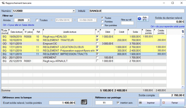 Au fur et à mesure, le total du « solde pointés » doit s'approcher du solde du dernier relevé saisi et l'écart affiché en bas doit tendre vers zéro si toutes les opérations du relevé ont bien été passées en comptabilité. On peut avoir dans ce cas des lignes non pointées, c'est-à-dire des opérations qui non pas encore été comptabilisées par la banque…
